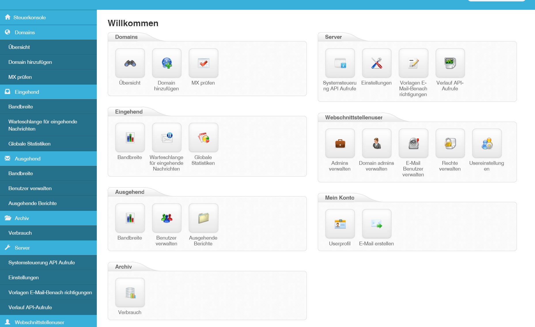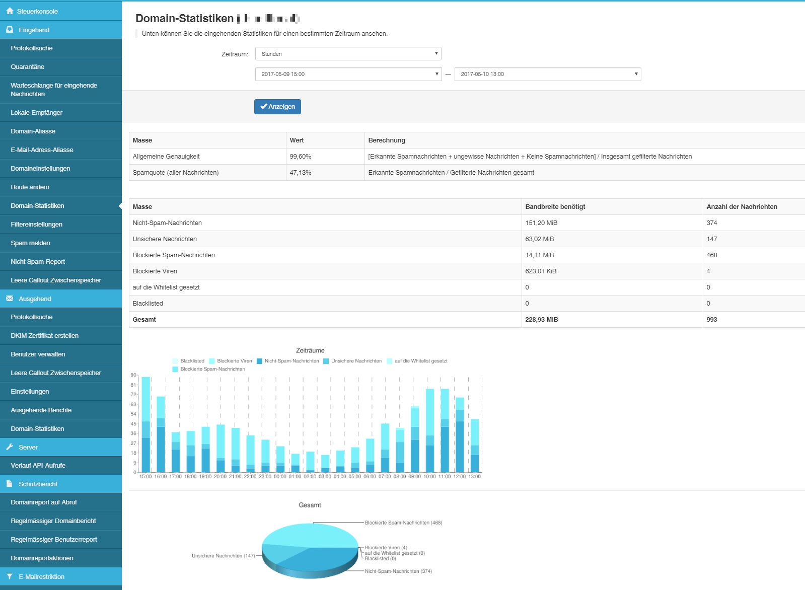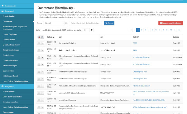 Für eine Suche können Sie dort alle E-Mails durch weitgehende Filter prüfen und sich darüber informieren, ob E-Mails angenommen oder abgelehnt wurden mit dem jeweiligen Grund dafür. Damit haben Sie die volle Kontrolle über alle E-Mails, die Ihre Domains betreffen.